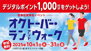 株式会社アールビーズが毎年実施している、スマホアプリを使用した1ヵ月間のオンラインイベント。10月中のウォーキングの歩数やランニングの走行距離を競い、その結果は個人・自治体のランキングに反映されます。目黒区の掲げる目標値を達成し、かつアンケートに回答された方には区内商店で使えるデジタルポイント(1,000円分)がプレゼントされます